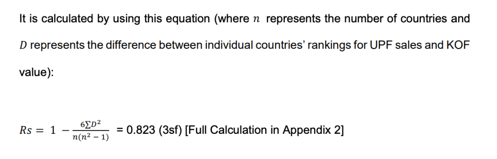 It’s not explicitly stated in the marking rubric, but you need some sort of statistical analysis (i.e. not just bar graphs and pie charts). My way of doing this was just finding two variables that corresponded to each of my topics (globalisation with Geography and processed food sales with Biology), getting secondary data from it online and then presenting a scatter graph with a worked example of Spearman’s.